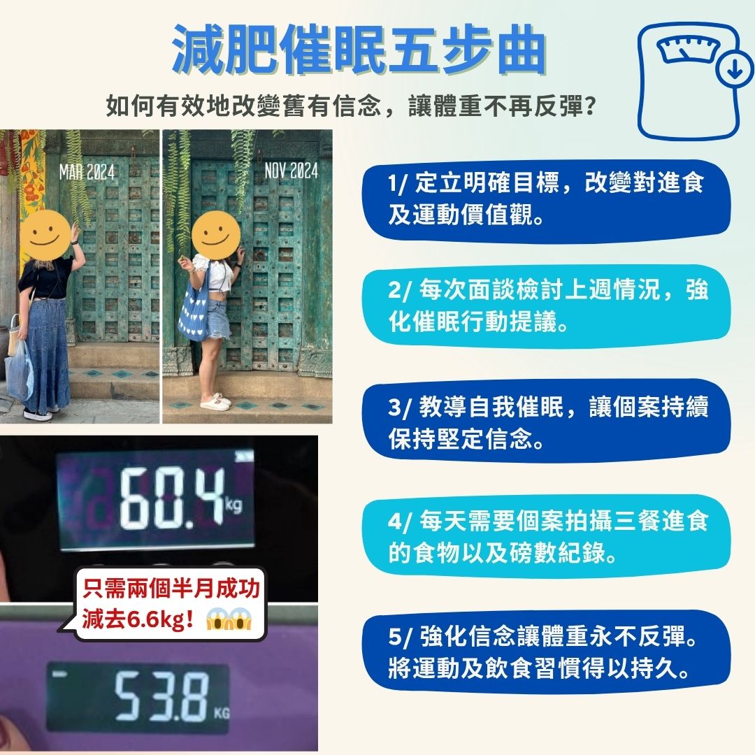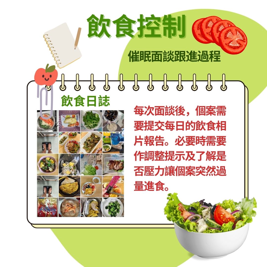 • 第六次會面:強化對控制飲食/運動信念,讓潛意識得以知道並且變成生活衝常習慣。